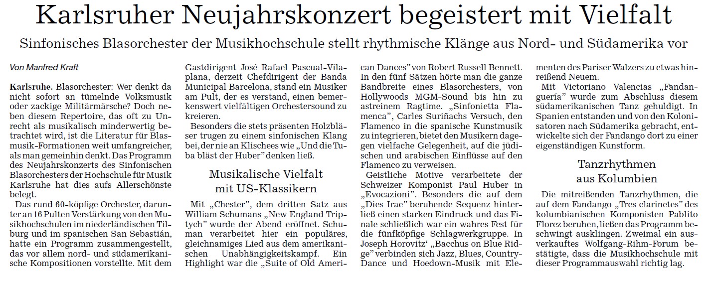 The programme of the New Year's Concert proves beautifully that the repertoire for wind ensembles is far more extensive than is commonly thought, writes Manfred Kraft in the Badische Neueste Nachrichten newspaper. Read the full article here